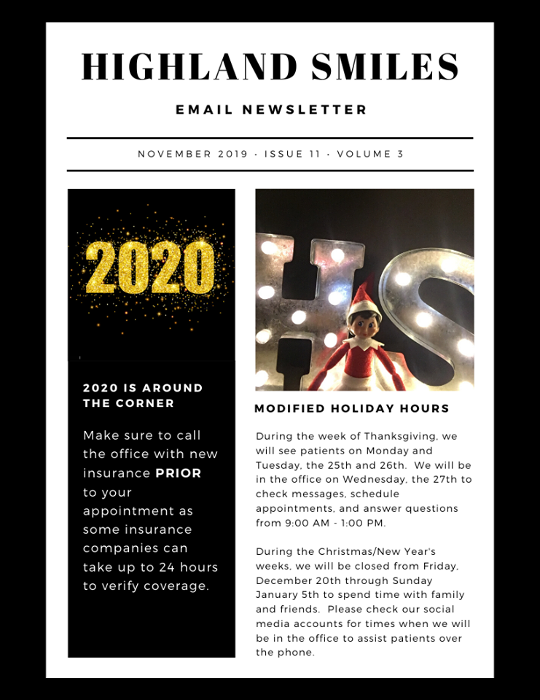 Highland Smiles takes patient health and safety very seriously. During our office closure, our team has been working hard learning how to keep everyone safe when the doors open again. We are getting the practice ready to re-open in the next few weeks with new safety measures ...